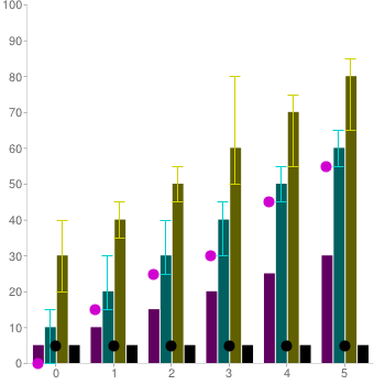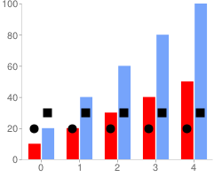 The following example shows how to add several different marker types to individual bars in a grouped bar chart. Note how the black circle is centered on the groups, because it specifies a hidden series as the placement series.