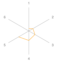 | When x-axis labels are included in a radar chart, the spacing of the data points around the chart is determined by the number of labels, or the number of data points, whichever is larger. In both these charts, the number of data points is the same (five), but the first has fewer labels, and the second has more labels. The first chart assigns data locations according to number of data points, and the second according to the number of labels. Notice that the second chart has six segments, which gives seven points to make a complete circle. |